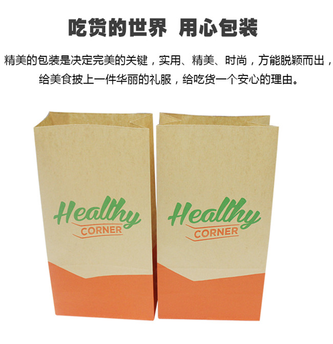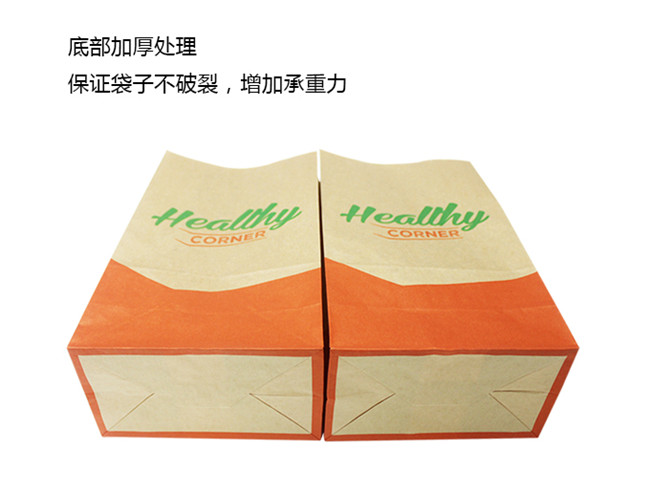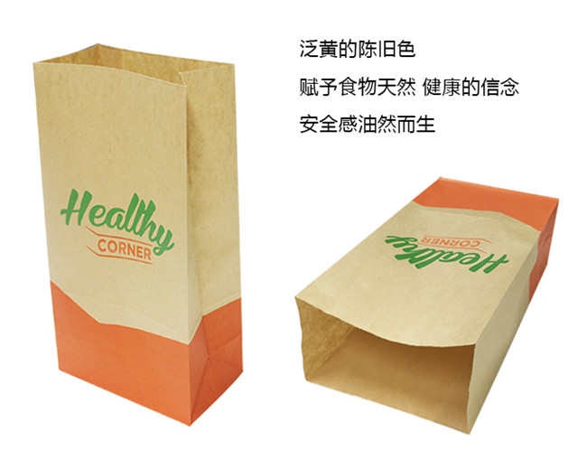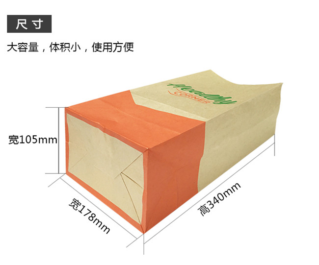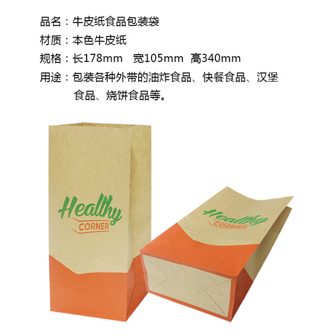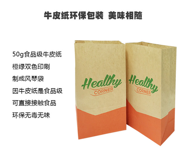 50g食品級牛皮紙,橙綠雙色印刷,制成風琴袋,因牛皮紙是食品級,可直接接觸食品,環保無毒。用途:包裝各種油炸食品,快餐食品,漢堡食品、燒餅食品等。