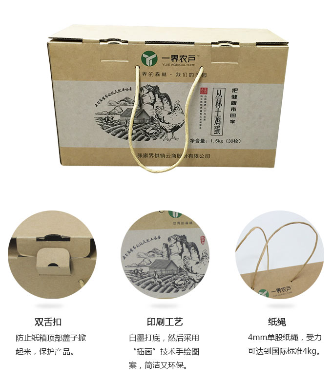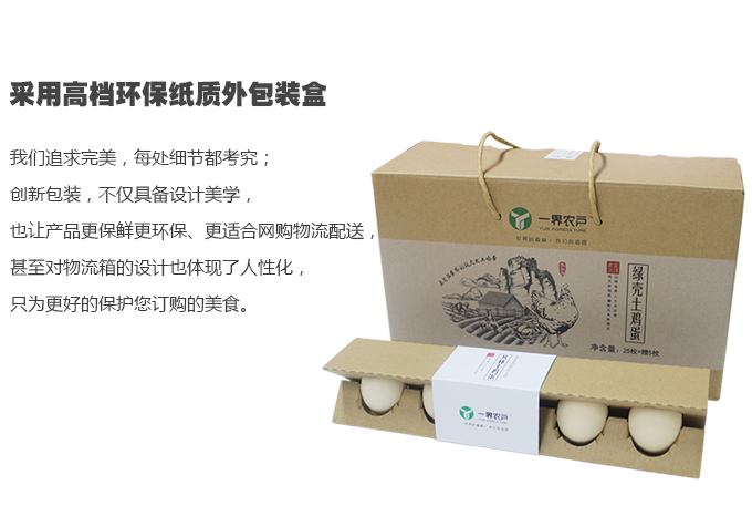 一界農戶土雞蛋禮品包裝盒我們追求完美,每處細節都考究;創新包裝,不僅具備設計美學,也讓產品更保鮮、更環保、更適合網購物流配送;甚至對物流箱的設計也體現了人性化,只為更好的保護您訂購的美食。